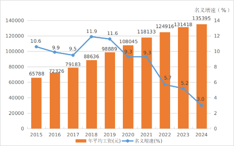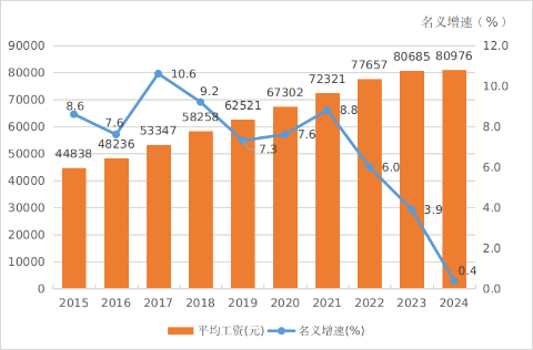 2015-2024年广东城镇非私营单位就业人员年平均工资及增速