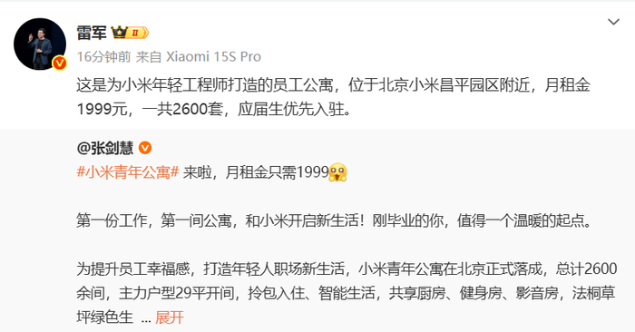 雷军:小米为年轻工程师打造员工公寓,位于北京小米昌平园区附近,月租金1999元 每日经济新闻 每日经济新闻官方账号 2025.07.0113:45 关注 每经AI快讯,7月1日,雷军官方微博发文称小米为年轻工程师打造员工公寓,位于北京小米昌平园区附近,月租金1999元,一共2600套,应届生优先入驻。