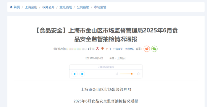 上海市金山区市场监督管理局2025年6月食品安全监督抽检情况通报