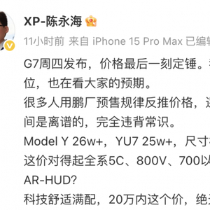 陈永海表示,公司正针对小鹏G7的成本进行反复核算,同时结合产品定位及市场预期综合权衡定价方案。对于部分市场声音认为其起售价可能进入小鹏G6价格区间的猜测,他直言“这是离谱的,完全违背常识”。