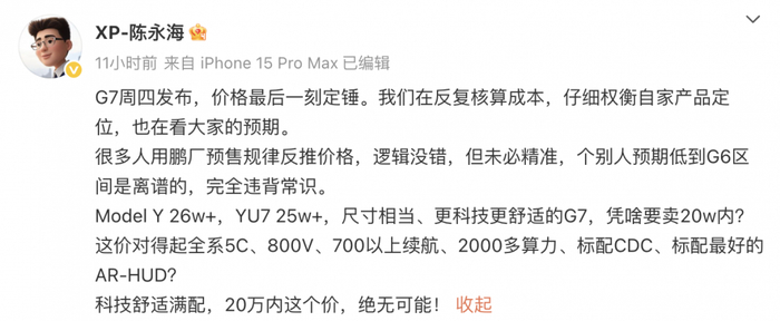 7月1日消息,小鹏汽车副总裁陈永海近日在其个人社交账号就旗下即将发布的小鹏G7定价问题公开回应市场关切,明确表示该车型起售价低于20万元“绝无可能”。
