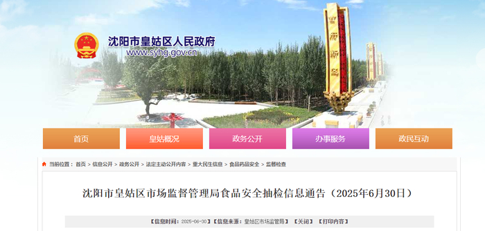 沈阳市皇姑区市场监督管理局食品安全抽检信息通告(2025年6月30日)
