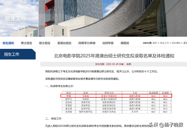 九派新闻查询北京电影学院研究生院官网发现,在5月29日公示的北京电影学院2025年港澳台硕士研究生拟录取名单中,钟懿赫然在列。