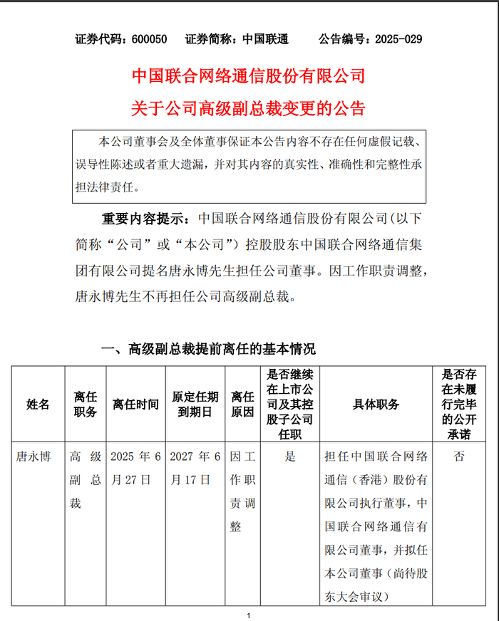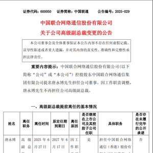 刚刚,中国联通发布重磅公告:唐永博先生不再担任...