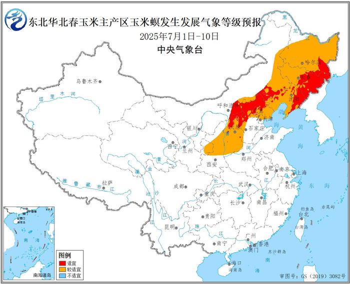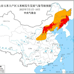 预计未来10天(7月1-10日)东北、华北及西北地区东部春玉米主产区大部气温接近常年或偏高,并有明显降水过程,其中吉林东部、辽宁大部、河北、山西、陕西中北部等地降水量有60~90毫米,部分地区有100~180毫米,较常年同期偏多3~7成,部分地区偏多1~2倍。根据玉米螟发生发展气象等级预报模型和未来天气趋势预报,东北地区大部、华北北部和西部、陕西中北部春玉米主产区玉米螟发生发展气象等级较高,黑龙江东南部、吉林东部、辽宁东部、河北北部、山西北部以及内蒙古中部偏南地区玉米螟发生发展气象等级高(附图)。建议各地密切监测虫情,抓住晴好天气或降雨间歇,对达到防治指标玉米田块及时防治,对发生程度偏重的田块采取药剂灌心、喷雾等措施集中防治,避免或减轻玉米螟危害。