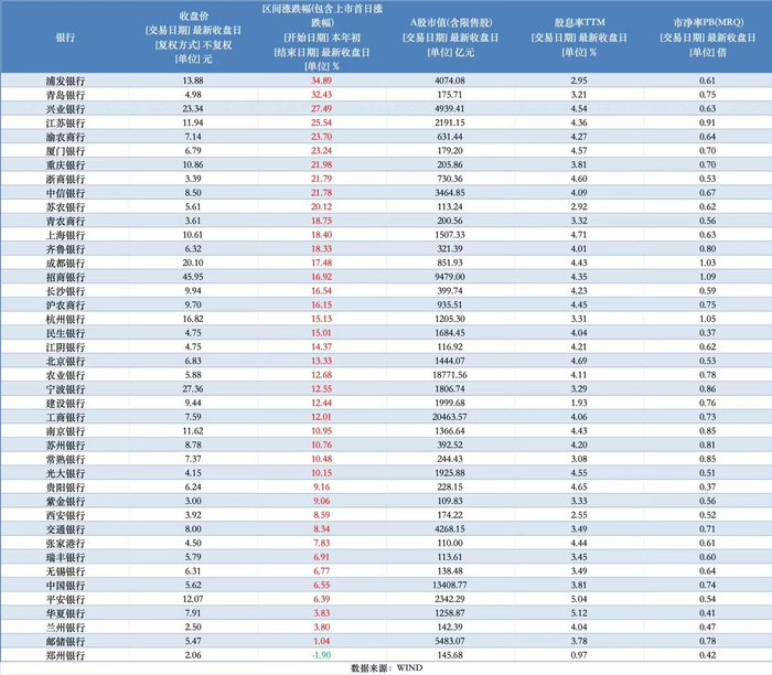 具体看个股表现,A股上半年有29只银行股涨幅超过10%,其中10只个股涨幅超过20%,更有两只个股涨幅超过30%,分别是浦发银行(600000.SH)(34.89%)、青岛银行(002948.SZ)(32.43%)。此外,兴业银行(601166.SH)、江苏银行(600919.SH)涨幅也超过25%。