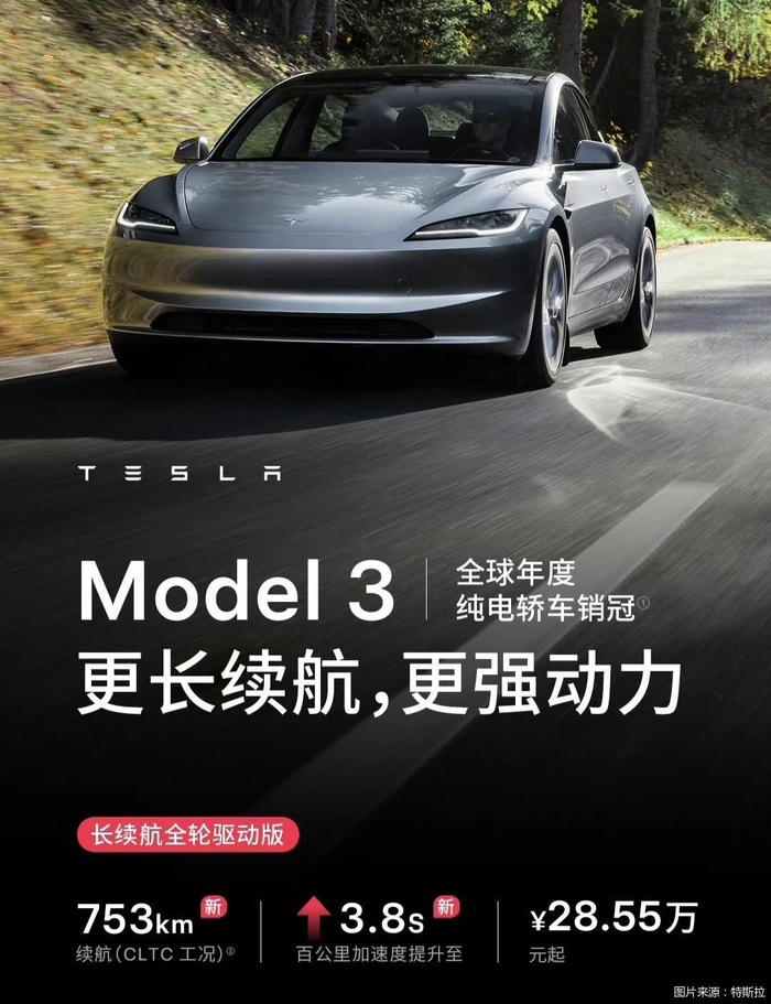 本次Model 3长续航版涨价,源于车型升级。据了解,Model 3长续航全轮驱动版CLTC续航增至753公里,百公里加速缩短至3.8秒。据了解,Model 3长续航版搭载新的电池包,电池可用度数未变化,但采用新的化学配方并通过整车优化,提升车辆的续航里程,新电池也更加耐用。同时,特斯拉相关负责人表示,本次Model 3长续航版进一步缩短0—100公里/小时的加速时间,并非由于硬件变化,而是免费配置了售价1.41万元的加速提升软件包。