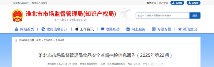 安徽省淮北市市场监督管理局食品安全监督抽检信息通告(2025年第22期)