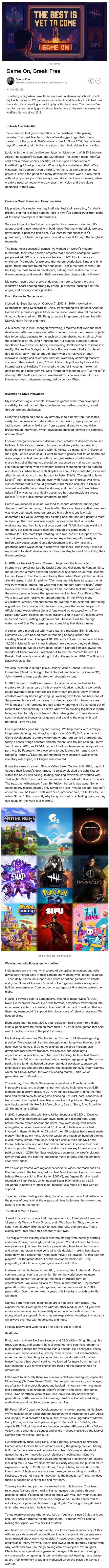 游戏,源自纯粹的想象力,是一个非零和的游戏。它们扩展了蛋糕。伟大的游戏做到了其他媒介无法做到的事情:同时带给你情感、沉浸感和互动性。创新无法被垄断或阻止。只要我们继续共同努力,这个行业将永远充满机会和希望。