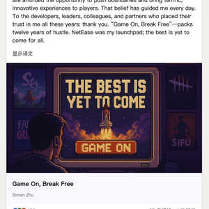 在网易游戏度过了难以置信的十二年后,我即将结束这一篇章,怀揣的依然是从第一天起便驱动着我的那份热情。能够从事游戏行业,是一种荣耀。我热爱这个行业,并坚信它的未来属于那些被彻底释放潜能的创作者,特别是那些被给予机会去突破边界、为玩家带来精彩创新体验的人。正是这种信念,一直指引着我前行。感谢这些年来给予我信任的开发者、领导、同事与合作伙伴:谢谢你们。‘Game On, Break Free’——这句话浓缩了我十二年的奋战。网易是我的起点,而属于我们所有人的精彩,还在前方。