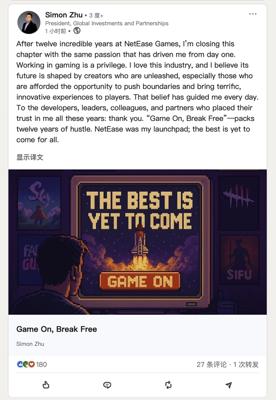 网易游戏全球投资和合作伙伴关系部总裁朱原(Simon Zhu)今日(4月25日)在领英发布长文,宣布将离开网易游戏。