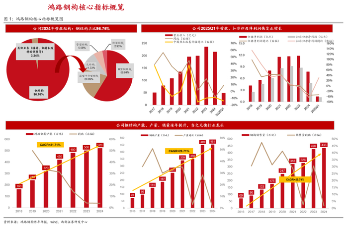 ● 鸿路钢构是钢结构制造龙头,规模、成本等竞争优势突出,坚持智能化改造,焊接机器人打开产能天花板、降成本可期,未来竞争能力有望进一步提高,强者恒强,市占率提升空间大,我们给予公司2025年18倍PE,对应目标价为23.47元/股,首次覆盖,给予“买入”评级。