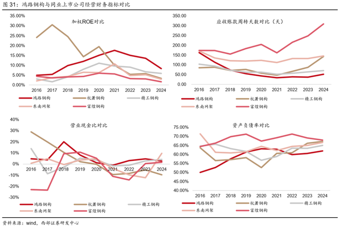 ●与同业对比,公司盈利能力强,现金流较好,应收账款周转速度快,资产负债率低。公司主要产品广泛应用于工业厂房、大型场馆、机场、火车站、石化管廊、设备装置、高层建筑、桥梁等诸多领域,下游需求多样化,因此公司经营整体优于同业公司。从鸿路钢构与同行业上市公司历年经营指标对比来看,近年来公司加权ROE、营业现金比均普遍好于同业公司,且由于公司业务以制造类订单为主,货款回收周期短,因此公司应收账款周转天数近年均低于同业公司,此外资产负债率也普遍低于同业公司。