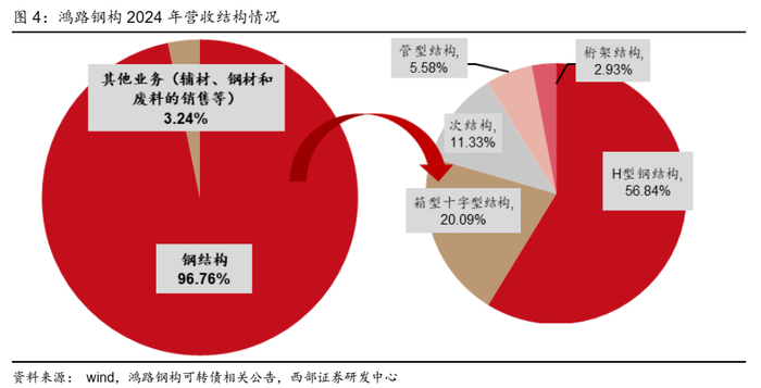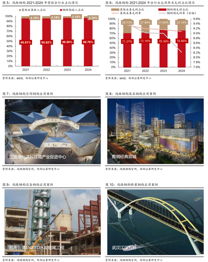 ● 钢结构业务收入占比95%以上,毛利占比70%以上。近几年公司逐步确立了以钢结构加工制造为核心、其他业务相辅助的经营战略,2021年以来公司钢结构业务收入占比保持在95%以上。2024年公司实现营业收入215.14亿元,钢结构收入占比96.76%,其中H型钢结构、箱型十字型结构、次结构、管型结构、桁架结构分别占比56.84%、20.09%、11.33%、5.58%、2.93%;其他业务(主要是辅材、钢材和废料的销售)占比3.24%。毛利率方面,公司钢结构业务明显低于其他业务毛利率,2024年钢结构、其他业务毛利率分别为8.21%、73.89%,毛利占比分别为76.86%、23.14%。
