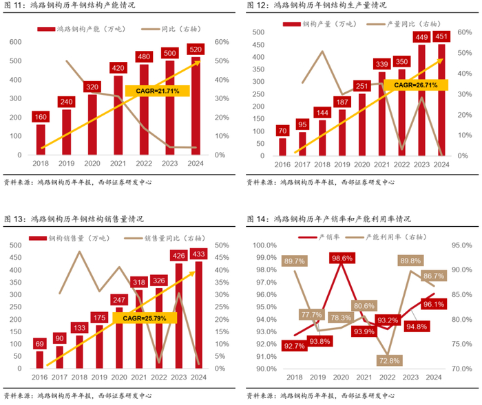 ● 钢结构产能稳步提升,2024年产能已达520万吨;产量、销量持续上升。公司钢结构产能稳步快速提升,2018-2024年产能从 160万吨提升至520万吨,年复合增长率为21.71%;产量和销量持续爬升,2016-2024年产量从70.24万吨提升至451.07万吨,年复合增长率为26.71%,销售量从69.13万吨提升至433.40万吨,年复合增长率为25.79%。截至2024年末,公司钢结构产销率为96.08%,同比提升1.24个pct,相比2018年提升3.36个pct;产能利用率为86.75%,同比下滑3.02%,相比2018年下滑3.00个pct。随着公司智能化改造持续推进,我们认为公司未来产能利用率将会逐步得到提升。