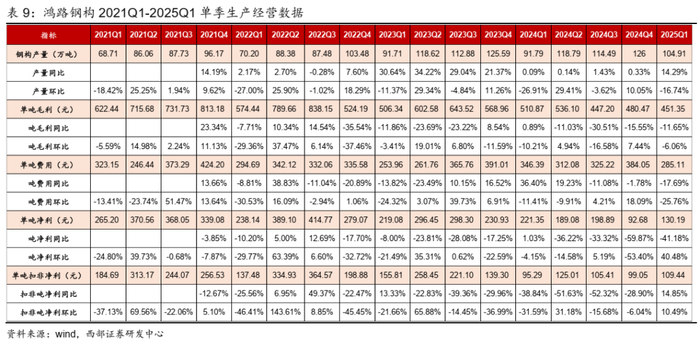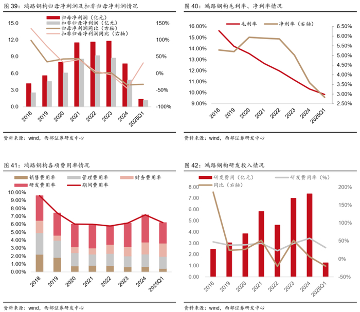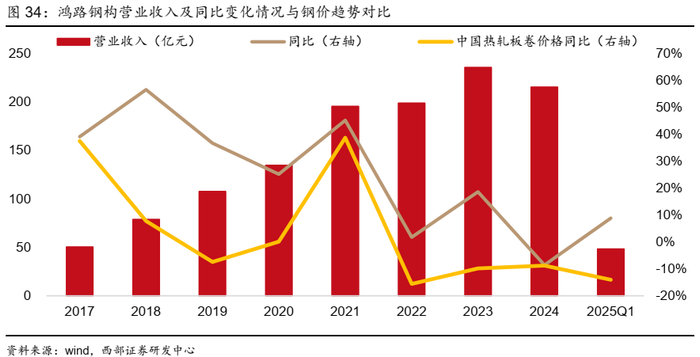 ● 2017-2023年公司营业收入持续稳健增长,2024年首次出现下滑,与钢价下行有一定关系。公司产品销售以成本加成方式定价,即“材料价+加工费”,而原材料中80%左右是钢材成本,因此钢价下行周期会影响公司收入和新签销售金额。比如2021年公司钢结构销售量317.96万吨,营业收入195.15亿元,当年中国热轧卷板平均价格达到5413元/吨,而2024年公司实现钢结构销售量433.40万吨,相比2021年销售量增加36%,但营收215.14亿元,相比2021年营收仅增长10%,主要因为2024年中国热轧卷板平均价格仅为3756元/吨,相比2021年下滑了31%。