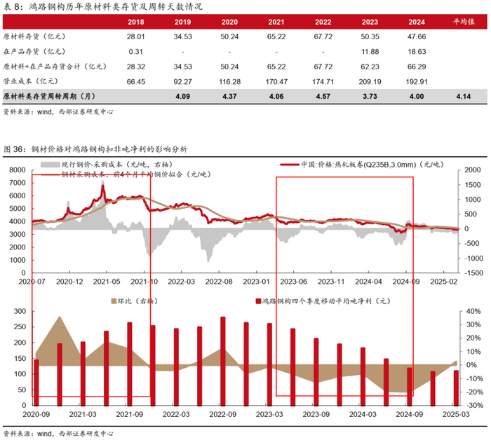 ●存货导致钢材成本滞后于钢价变化,钢价下行拖累净利润。钢结构企业通常会准备一定规模的钢材存货以满足订单生产交付,但是鸿路钢构与客户签订合同时是按照实时钢价进行报价,成本端则采用平均法计算原材料尤其是钢材成本,所以多数情况下,公司扣非吨净利变化趋势与钢价变化趋势正相关。