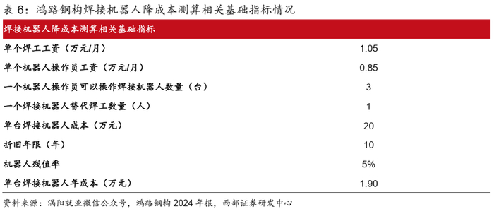 ● 根据涡阳就业微信公众号2025年发布的鸿路钢构招聘岗位信息,气保焊工人月薪6000-15000元,我们假设焊工薪资取其中值为10500元,焊接机器人操作技术员综合月薪5000-12000元,同样假设焊接机器人操作员的薪资取其中值为8500元/月。柏楚电子的智能焊接机器人售价28万元,公司焊接机器人为自己集成,我们假设单台成本为20万元,按照折旧年限10年,残值率5%进行折旧。此外保守假设,1台焊接机器人替代1个焊工,1个机器人操作员可以操作3台焊接机器人。