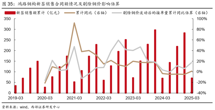 ● 25Q1公司新签销售额结束24年四个季度的下滑,恢复正增长1.25%,剔除钢价下滑影响后接单量约同比增长近18%,或反映出下游需求有所转好。25Q1公司新签销售合同70.52 亿元,同比+1.25%;考虑到25Q1钢材均价同比-14%,剔除钢价下跌影响,我们估算25Q1接单量同比+18%左右。