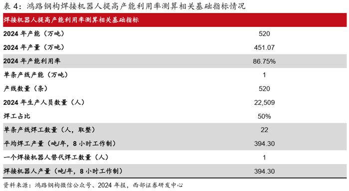 ● 根据公司蚌埠生产基地6条生产线对应6万吨产能计算,我们假设公司1条生产线平均1万吨产能,2024年公司产能520万吨,对应520条产线;2024年公司生产人员数量22509人,我们假设其中焊工数量占比50%,计算得到平均1条产线焊工数量取整为22名,并保守假设1台焊接机器人替代1名焊工。