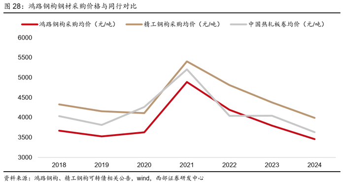 ● 历年来看,公司钢材采购均价基本低于市场均价和同业公司。钢结构行业的主要原材料是钢材,钢材成本占钢结构产品生产成本约80%。2024年公司钢材采购单价为3459元/吨,低于市场钢材均价3633元/吨,同样也低于同业公司精工钢构采购均价3991元/吨。