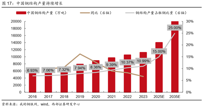 ● 钢结构产量持续增长,2023年达1.12亿吨,2025、2035年规划目标分别达到1.4、2亿吨。近年来我国钢结构市场迅速发展,钢结构产量由2014年的4200万吨增至2023年11200万吨,增幅达167%,年均增速为11.6%。但是2023年我国钢结构产量占粗钢产量的比重为10.99%,较发达国家平均30%的比重仍有较大差距。据中国钢结构协会发布的《钢结构行业“十四五”规划及2035年远景目标》,到2025年,全国钢结构用量达1.4亿吨,将占全国粗钢产量比重达15%以上,到2035年全国钢结构产量将达2亿吨,将占全国粗钢产量比重达25%。在政策推动下,预计钢结构行业未来十年将继续保持较快增长。