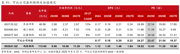 我们预计2025-2027年,公司营业收入分别为236.60、257.32、279.53亿元,增速分别为10.0%、8.8%、8.6%;归母净利润分别为9.00、10.08、11.29亿元,增速分别为16.5%、12.0%、12.1%。我们选取东南网架、精工钢构、杭萧钢构(与公司同属于钢结构细分板块)作为可比公司,2025年可比公司平均PE估值为23.47倍。鸿路钢构是钢结构制造龙头,坚持智能化改造,未来打开产能天花板、降成本可期,竞争能力有望进一步提高,市占率有望继续提升,我们给予公司2025年18倍PE,对应目标价为23.47元/股,首次覆盖,给予“买入”评级。