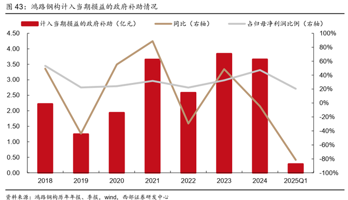 ● 具体来看,公司2021年公司专门成立智能制造研发团队,2023年以来自主研发 “弧焊机器人控制系统”,2024年公司加大对焊接机器人、激光智能切割、自动化喷涂等方面研发投入,因此近几年公司研发费用保持高位。2024年公司研发费用7.40亿元,在2023年高基数基础上继续保持增长5.67%,相应对公司净利润有所影响。