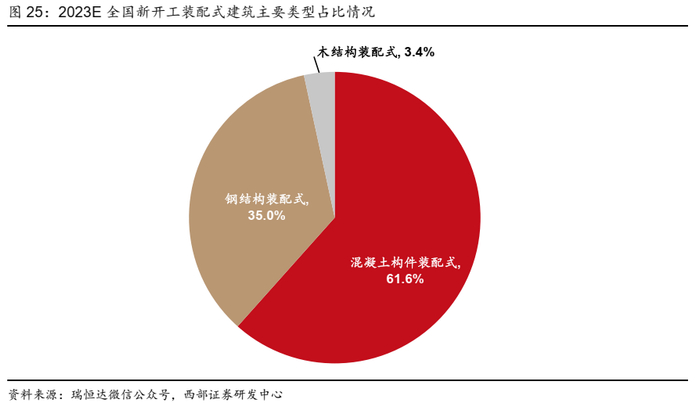 ●现阶段我国装配式建筑主要以混凝土结构为主。根据瑞恒达推算,2023年全国新开工装配式建筑中,混凝土结构建筑占比61.6%,钢结构建筑占比35.0%,木结构建筑占比3.4%。