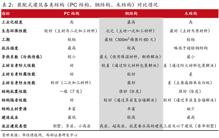 ●装配式建筑包括混凝土结构、钢结构以及木结构三大类,钢结构工业化程度最高,工期最短。从工业化程度与环保性能角度看,钢结构工业化程度最高,工期最短,主材自身防虫性能最好,抗震性能很好,虽易导热,防火性能较差,但均可以通过保温材料或者防火材料等解决。从建筑类型来看,钢结构适用于高层、超高层、抗震要求高的建筑。