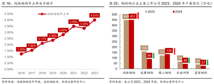 ● 钢结构行业集中度低,2023年鸿路钢构市占率提升至4.01%,上市公司CR5占比仅7.46%。根据钢结构产量数据,2023年钢结构行业主要上市公司中,鸿路钢构当之无愧为行业龙头,但市占率仅为4.01%,其他杭萧钢构、精工钢构、东南网架、富煌钢构市占率分别为1.42%、1.09%、0.59%、0.36%,CR5合计市占率仅为7.46%。2024年钢结构上市公司中,只有鸿路钢构和精工钢构两家钢结构产量有所增加,杭萧钢构、东南网架、富煌钢构产量均有所下滑,我们预计鸿路钢构市占率将继续得到提升。