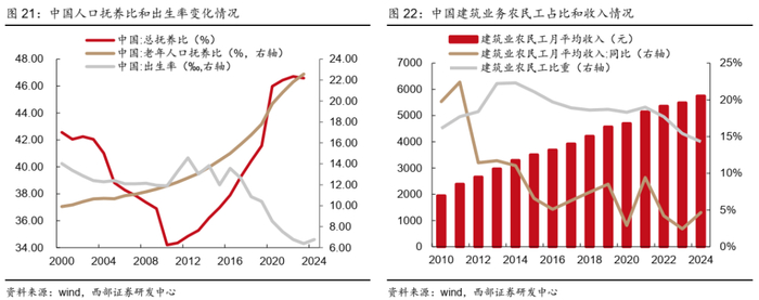 ● 人口红利消退,用工难、用工贵使得装配式建筑大势所趋。近年来我国老年人口增速快,高龄化趋势明显,传统的人口红利开始消退,总抚养比在2010年出现拐点,之后开始持续上升,老年人口抚养比从2000年的9.92%上涨至2023年的22.57%,而出生率从2000年的14.03‰下滑至2024年的6.77‰。此外,建筑业从业人员占比呈现下降趋势,2024年建筑业农民工占比14.3%,相比2014年的高点下滑8.0个pct;且建筑业农民工月均收入不断上涨,2024年月平均收入为5743元,同比增长4.65%。发展装配式建筑、钢结构住宅可以有效减少现场操作,继而减少劳动力需求,大势所趋。