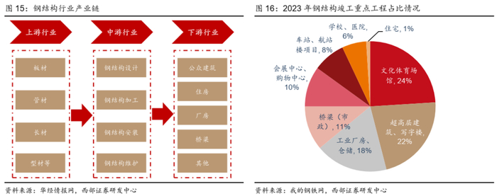 ● 文体类场馆、超高层写字楼、厂房类建筑合计占钢结构工程的64%。根据2023年钢结构竣工重点工程统计来看,文化体育场馆占比24%,超高层建筑、写字楼占比22%,工业厂房、仓储占比18%,桥梁(市政)占比11%,会展中心、购物中心占比10%,其他还有一些车站、航站楼、学校、医院及住宅项目。