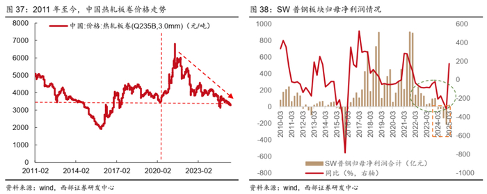 ●钢价继续大幅下行空间有限。我国热轧板卷价格从2021年5月开始持续震荡下行3年时间,截至2025/6/27,热轧卷板价格3287元/吨,已经低于上一个低点(2020年4月)。同时,2022Q1-2024Q4,SW普钢板块(包括长材、板材、钢铁管材)归母净利润持续下滑,尤其2024年,板块持续亏损,钢材企业业绩承压。此外,国务院《2024-2025年节能降碳行动方案》要求“加强钢铁产能产量调控。严格落实钢铁产能置换,严禁以机械加工、铸造、铁合金等名义新增钢铁产能。新建和改扩建钢铁冶炼项目须达到能效标杆水平和环保绩效A级水平”,并且“到2025年底,钢铁行业能效标杆水平以上产能占比达到30%,能效基准水平以下产能完成技术改造或淘汰退出”。我们认为,钢企利润压力叠加政策调控钢铁产能产量,钢材供给端有望得到控制,钢价大幅下行空间有限,未来对公司收入利润的负面影响也有限。