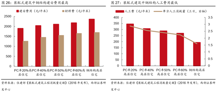 ● 钢结构装配式占比较低原因在于成本较高,但是随着PC预制率的增加而减小。根据住建部《装配式建筑工程消耗量定额》数据,从高层住宅装配式建筑项目来看,钢结构建筑的建安费用为2360元/平方米,均高于PC率20%、40%、50%、60%建筑建安费用分别为1896、2037、2106、2175元/平方米。但是随着PC装配率的提升,钢结构和PC建筑之间的建安费用差距逐渐缩小。