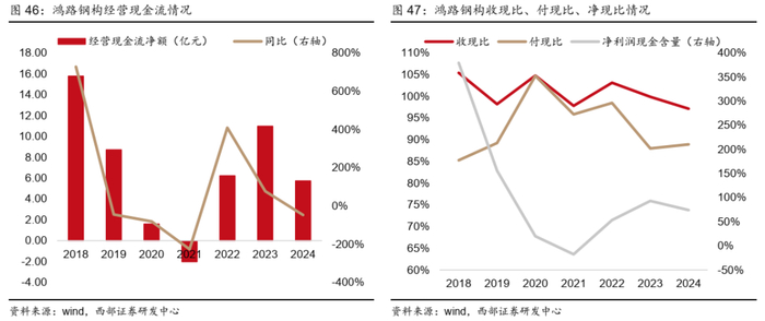●2018-2024年公司经营现金流基本为正,收现比高于97%。公司制造类订单,销售结算方式通常为现款现货,先付定金,合同生效,再付款提货。但是公司对订单金额稳定增长且回款情况良好、资金实力强、信用记录良好的优质客户,授予一定的信用额度,在额度内给予赊销,账期一般不超过1年。因此公司经营现金流情况较好,近三年经营现金流均为正,收现比超过97%。2024年经营现金流净流入5.73亿元,同比减少47.77%,净利润现金含量74.25%。