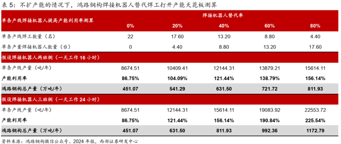 ● 不扩产能情况下,焊接机器人替代人工,年产量有望突破800万吨。我们分别假设焊接机器人替代率从0%到80%(替代率0%即全部为焊工进行焊接,替代率80%即80%的焊工被焊接机器人替代),并且公司产能不扩张,保持2024年的520万吨,我们测算若焊接机器人采取两班倒的方式,即一天工作时间为人工的2倍(16小时),机器人替代率20%、40%、60%、80%的情形下,对应的每年产量分别能达到541、632、722、812万吨;更理想情况下,若焊接机器人采取三班倒的方式,即一天工作时间为人工的3倍(24小时),机器人替代率20%、40%、60%、80%情形下,对应的每年产量分别能达到632、812、992、1173万吨。其中在焊接机器人一天工作时间16小时、机器人替代率80%的情况下,公司产量能够达到812万吨,相比2024年公司产量451万吨接近翻倍,为公司业绩增长提供充足想象空间。