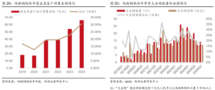 ●公司与中建、中冶等总承包企业建立了良好的战略合作关系,对加工精度高、制造难度大、工期要求紧的钢结构订单具有较强的竞争优势。公司具有完善的配套工厂,减少外协或外购半成品,提高生产效率,“打造一站式钢结构及其配套产品采购平台”;此外,公司十大生产基地布局合理、产能大,公司统一生产调度,充分发挥大项目多基地协同制造快速交货优势;因此公司与中建、中冶等总承包企业建立了良好的战略合作关系,大客户占比逐步提升,截至2024年,前五名客户合计销售额65.85亿元,占比30.61%,同比提升7.76个pct。此外公司对加工精度高、制造难度大、工期要求紧的钢结构订单具有较强的竞争优势,2024年全年公司新签销售合同中,大合同金额占比22.69%。