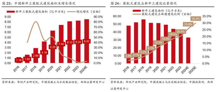 ● 新开工装配式建筑面积占比逐年提升,2024年占比25.8%,住建部要求2025年要占比30%以上,仍有提升空间。根据中国建筑业新型建筑工业化发展研究报告(2024),2024年全国新开工装配式建筑面积预计为 8.5 亿平方米,同比增长3.2%,占我国新开工建筑面积的25.8%,同比提升5.4个pct。我国住建部《“十四五”建筑业发展规划》提出大力推广应用装配式建筑,积极推进高品质钢结构住宅建设,鼓励学校、医院等公共建筑优先采用钢结构。到2025年,装配式建筑占新建建筑的比例达30%以上。