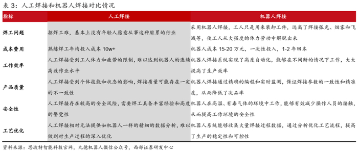 ● 相对人工优势明显,焊接机器人代替人工已是企业立足的趋势。目前大部分企业都面临工人贵,招工难的问题,鸿路钢构长期以来,订单饱和,熟练焊工是制约公司产量提升的主要原因。机器人焊接系统实现了高度自动化,能够在不间断的情况下工作,而人工焊接受到工人体力和疲劳的限制。并且机器人焊接通过精确的编程和实时监测,保证焊接参数的一致性和精准度,而人工焊接受到个体技能和状态的影响。此外,机器人系统能够收集大量焊接过程数据,分析优化工艺流程。尽管机器人焊接在前期投资成本上相对较高,但长期来看,其提高产量、质量、生产效率可期,以及降低公司吨成本。