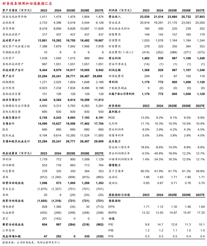 ● 因此,我们预计公司2025-2027年营业收入分别为236.60、257.32、279.53亿元,增速分别为9.91%、8.76%、8.63%;综合毛利率分别为10.52%、10.45%、10.39%。