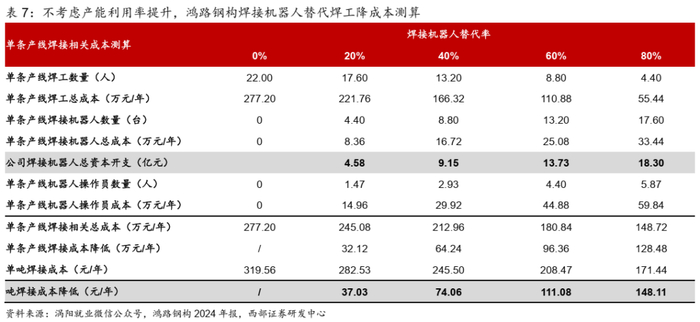 4.2.2 不考虑产能利用率提升,焊接机器人替代人工有望降低吨成本37-148元