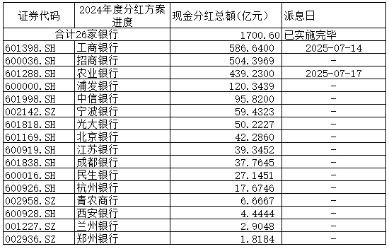截至6月30日,A股42家上市银行中已有26家的银行完成年末分红,合计分红总额达1700元。7月份,分红总额较大的工商银行、农业银行的“千亿红包”也将陆续到账。