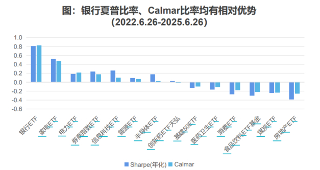 公募基金:当前银行较业绩基准少配程度最多,且银行行业长周期收益优于多数行业。《关于加快推进公募基金行业高质量发展的意见》强化业绩比较基准的约束作用,并提出全面加强长周期业绩考核,其中三年以上中长期收益考核权重不低于80%。2022.6.26-2025.6.26银行ETF Calmar比率及sharpe比率在行业ETF中领先。