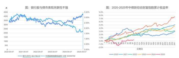 固收+基金有增配银行股动力。截至2025Q1固收+基金(一级+二级+灵活配置+偏债混合)持有银行股比例已经同比显著提升,总体持股金额尚低。2025年债基收益已较2020-2024年同期明显回落,银行股同样可用于增厚稳健型产品收益。