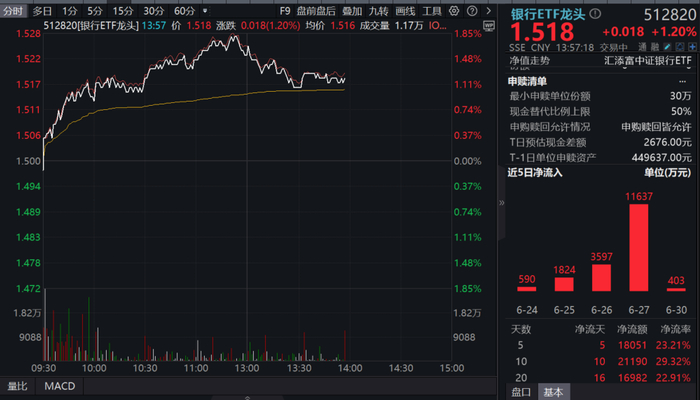 从ETF资金流向来看,以银行ETF龙头(512820)已连续13日累计“吸金”2.37亿元!