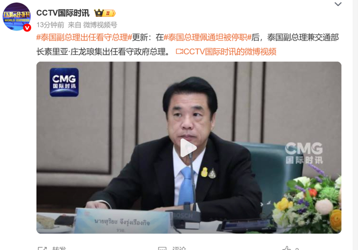 最新消息:在泰国总理佩通坦被停职后,泰国副总理兼交通部长素里亚·庄龙琅集出任看守政府总理。