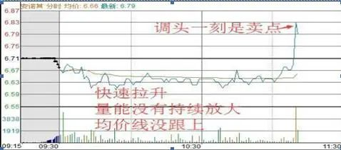 6、快速拉升,量能没有持续放大,而且均价线没跟上,调头一刻是卖点(做T高抛点)。