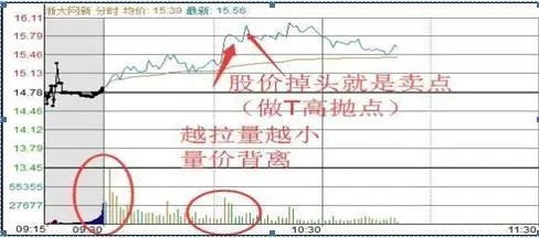 5、分时量价不齐,越拉量越小,逐步微缩构成量价背离,拉高调头属于卖点(做T高抛点)。