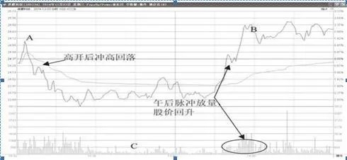 要点1:图显示,开盘价出现跳空回落以后,该股盘中脉冲放量。图中A、B两个位置的脉冲量能非常明显,股价在B位置明显放量回升。而图中的C位置量能维持高位,那么价格短线涨幅接近1%。我们可以考虑在C位置放量的时候股价高位做空,兑现T+0的持股收益。